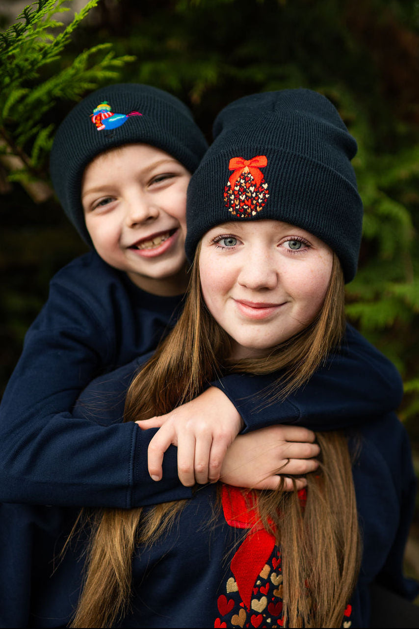 Kids Christmas Bird Embroidered Beanie Hat - Navy